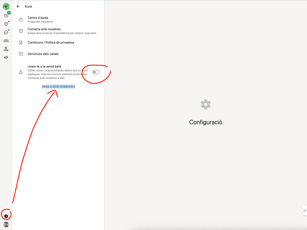 Paso 7: Envíanos el número de versión de tu Whatsapp web. Lo encontrarás en configuración, después Ayuda y en Pantalla. Desactiva la opción de Unirse a la versión Beta si es que la tienes activa.