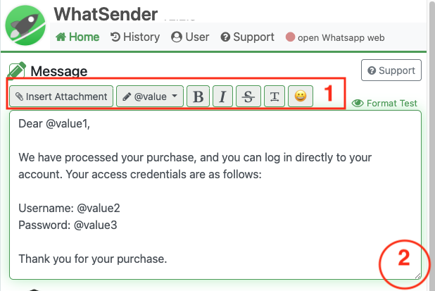 The @value button allows you to add custom fields to your messages. Keep in mind that, visually, you will only see @value1 and @value2. If you use @value3, @value4, and @value5, they remain stored in the browser cache and may not always appear on screen. For this reason, we recommend doing a test before sending to make sure the information is correct. We have also prepared this tutorial on how to personalize your messages.