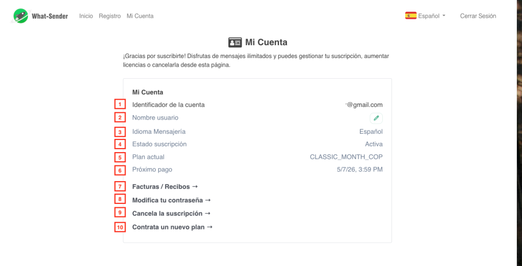 Si tienes una cuenta Personal con suscripción activa, ya sea mensual o anual, desde este panel podrás revisar la información de tu cuenta, consultar tus facturas, cambiar tu contraseña, cancelar tu suscripción o contratar otro plan.